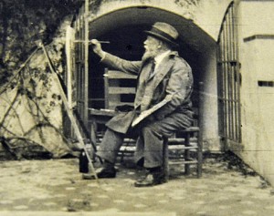 Imagen del pintor Joaquín Sorolla sentado delante de un lienzo pintando